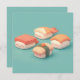 This heart-melting design features a group of four incredibly sweet sushi characters with simple, joyful faces and soft rosy cheeks. Rendered in a high-quality 3D clay style, the set includes a salmon nigiri with orange-and-white stripes, a rectangular tuna nigiri with deep red topping, a second salmon piece with unique markings, and a yellow tamago egg nigiri wrapped in a dark green seaweed band. The characters are made with a smooth, matte texture that mimics sculpted clay, and each piece features a chubby white rice body with a friendly, "kawaii" personality. Set against a clean, solid teal background, the overall aesthetic is modern, bright, and full of gentle charm, making it an irresistible choice for any fan of Japanese cuisine or whimsical food-themed art. This cheerful sushi postcard is a wonderful choice for sending a "soy happy for our friendship" note or a playful greeting to a fellow seafood lover. You might choose to use this cute food card for a Japanese-themed dinner party invitation or to celebrate a fun culinary milestone with your family members. It also makes a precious decorative piece for a kitchen wall or a bright addition to a food-themed scrapbook as a small token of happiness. This versatile design is also an excellent choice for restaurant grand opening announcements, sushi-making class invites, or as a heartwarming way to share a short message of joy for any situation or event.