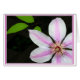 Una flor clematis brillante se muestra en el centro y se balancea con sus hojas.