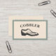 Una tarjeta de visita simple y elegante con un ilustracion de información sobre zapatos y personalizables, en tonos beige, negro y verde. Perfecto para actividades como reparación de zapatos, fabricación de botas, reparación de talones, taller de zapatos, etc.