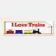 Pegatina para el parachoques colorida para todos usted entrena a amantes, con un tren colorido del dibujo animado completo con el motor y el caboose y yo rojos amamos los trenes en texto rojo intrépido.