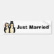 Gran pegatina para el parachoques para todos lo que usted se casa nuevamente. Apenas casado en texto negro intrépido y gráficos dulces de dos pingüinos se vistió como novia y novio. Decoración linda para nuevamente el coche del wed.