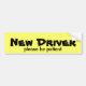¿Nuevo a las calles? ¿Tenga un adolescente que acaba de comenzar a conducir? ¡Puesto esta nueva pegatina para el parachoques del conductor para alertar el resto del tráfico y esperanzadamente serán un poco más respetuosos! El diseño fresco que ofrece un fondo amarillo y un "nuevo conductor sea por favor paciente" escrito en letras intrépidas, negras. Ésos son los colores que invocan la precaución. ¡No dude en para modificar para requisitos particulares!