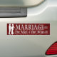 El matrimonio es igual a un hombre más una calcomanía de calcomanías de parachoques. Muestra tu apoyo al ideal conservador del matrimonio tradicional entre marido y mujer. Fondo rojo oscuro con letras blancas e imagen en la sombra de una pareja embarazada.