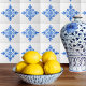 Baldosas cerámicas Azulejo Kitchen azules y blancas portuguesas españolas. Mejore su decoración en casa con nuestra teja azul, inspirada en el rico patrimonio cultural de Portugal y España y la belleza intemporal de los azulejos. Añade algunas para hacer una pared de acentos en tu cocina, cuarto de baño o comedor. Copyright Flourishing Mare LLC.