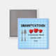 Este imán será un regalo excelente para tu abuela. Dice "Cocina de abuela - Comidas caseras servidas con amor". El fondo es de gingham azul claro.