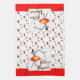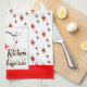 Una toalla de cocina retro con letras de personalizado y la leyenda "Kitchen Magician" mientras un mágico chef chica cocina un poco de magia en la cocina con letras brillantemente retro en negro, rojo y amarillo con bordes rojos y un patrón retro estrella negro y rojo.