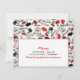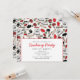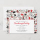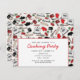 Una invitación de cocinar del fiesta con un modelo rojo y negro inspirado retro de cocinar fuentes. Modele los ilustraciones de las características de un mezclador, estufa, bátalos, espátula, rodillo, mitón del horno, y las cerezas. Personalice el texto en frente y la parte posterior.