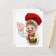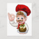 Un personaje de dibujos animados del cocinero que lleva un Santa tiene gusto del gorra que sostiene un pudín del navidad y que hace un gesto perfecto