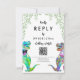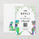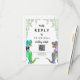 Tarjeta de respuesta de sitio web de código QR de RSVP de boda temática de dinosaurios en línea con divertidos novios dinosaurios con follaje de eucalipto de acuarela para traer alegría prehistórica del Jurásico a tu día de boda. Tipografía caprichosa moderna con plantillas fáciles de personalizar para que puedas agregar el código QR del sitio web de la boda y la dirección web del navegador e instrucciones útiles para los invitados. Novios T-Rex únicos y divertidos con arte original de greenery botánico de acuarela de la artista Catherine Sweetman. Ideal para la recepción del día de la boda o la cena de ensayo. La suite de boda a juego incluye todo lo que necesitarás en tu divertido viaje de boda.