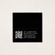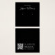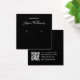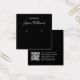 Una simple tarjeta de visualización de los anillos negros: sólo texto blanco sobre fondo negro, con los asientos de los anillos indicados por dos círculos muy pequeños. El nombre está escrito en un guión elegante. Tiene códigos QR en la parte posterior, en la parte inferior, a la izquierda de la información.