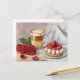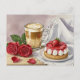 Pastel de queso latte de café con postales de comida de rosa roja de fresa para posttravesía