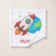 Esta toalla personalizada presenta un adorable cohete espacial rojo disparando su motor en el espacio sobre la Tierra.