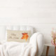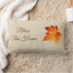 Esta almohada se muestra en un color beige neutro con una impresión de texto Bendice Este Hogar con un bonito acento de hoja de otoño.