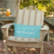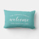Simplemente elegante almohada lumbar de lanzamiento característica "Bienvenidos" texto de escritura moderno en blanco con texto arqueado personalizado que puede ser personalizado con el monograma de apellido de su familia y la dirección de su calle. Diseño de dos caras en la parte delantera y trasera incluida. El texto blanco y el fondo azul acuático/turquesa se pueden modificar para que se coordine con la decoración de tu casa.
