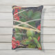 La imagen de esta almohada de acento al aire libre/interior se hizo a partir de una fotografía original de ZoeSPEAK de una pequeña y rápida brisa que se balanceaba a través de las frondas de palmera secas sobre las flores rojas de kalanchoe con sus hojas de color verde cervicales en el jardín.