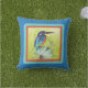 colibrí pintado de bonito sobre una colorida almohada azul. Se muestra como una almohada al aire libre para la piscina, el patio o el asiento del jardín, pero se puede utilizar fácilmente en el interior para acentuar cualquier habitación. Se han previsto varios tejidos de almohadas.