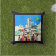 Tirar almohada en un ilustracion de tres elegantes gatos vestidos como turistas de pie ante un paisaje urbano futurista. La arquitectura evoca la estética de ciencia ficción de mediados de siglo. Los gatos sostienen cámaras, mapas y usan patios, lo que sugiere aventura. Las palmeras y el brillante cielo azul realzan el ambiente vacacional.