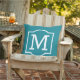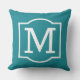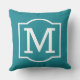 La almohada de acento cuadrado elegante y clásico al aire libre cuenta con un monograma inicial con un marco decorativo sencillo de color blanco con un color de fondo verde verde azulado. Personalizar el fondo para coordinar con tu decoración exterior.