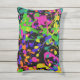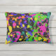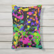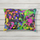 Esta divertida almohada tira salpicaduras de pintura en amarillo brillante, verde lima, naranja, verde azulado, azul violeta y rosa caliente. El fondo negro apaga los colores.