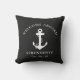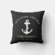Una almohada moderna de moda de temática náutica para el barco que cuenta con un ilustracion blanco de ancla sobre fondo negro. Puedes personalizar el texto de "Welcome Aboard" y el nombre y ubicación de tu barco en la moderna tipografía blanca.
