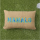 Color azul y cal. La parte delantera de esta almohada tropical exterior es un falso aplicativo de la palabra Mahalo sobre un fondo de tela de imitación. ¡Mahalo, es la palabra hawaiana para Gracias! La almohada se revierte a la impresión Olowalu donde los hibiscos gráficos se reproducen entre sí para crear un camuflaje moderno con el sabor de una estampilla vintage de aloha.