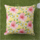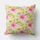 El diseño de las almohadas de estilo tropical presenta un patrón de flores de hibiscos rojas, amarillos y blancos vibrantes con un color de fondo amarillo.