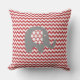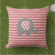 almohada al aire libre con rayas de chevron de color rojo y blanco brillante con elefante gris con orejas con motivos rojos y blancos.