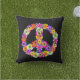 Una señal de paz floral en tonos rosas, amarillos, naranjas, violetas, verdes, blancos y negros componen el centro de esta almohada de moda boho.