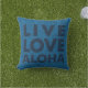 Denim Blue Colorway. Live, Love y Aloha es el mensaje en esta almohada diseñada que se revierte a una versión positiva del patrón de la palma de cebra en la espalda. Estas simples hojas gráficas de palma se inspiraron en las palmeras que se balanceaban. Sus simples rayas nos recuerdan los patrones de una cebra. Dos patrones de color como estos se usaban a menudo en los patrones vintage de los camisetas Aloha y Muu-Muus. Se coordina con otros productos para el mobiliario de la casa y se presenta en varias coloridas.