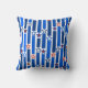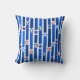 Esta almohada de tiro tiene un diseño del 4 de julio de líneas verticales en tonos azules rotas por estrellas de rojo y blanco.