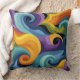 This abstract swirl throw pillow features flowing wave forms inspired by mid-century modern art and retro color theory. The design blends deep teal, ocean blue, golden yellow, burnt orange, olive green, and rich purple into a dynamic composition full of movement and rhythm.