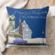 Esta almohada de tiro personalizado presenta un acogedor tema nocturno de invierno sobre un fondo azul oscuro. Una imagen de un pequeño auto es retratada conduciendo por las casas de un pequeño pueblo o pueblo en la víspera de los Navidades, con un árbol en su techo.