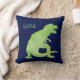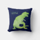 Cojín decorativo azulverde personalizado de la acuarela del dinosaurio de los muchachos. Silueta linda del dinosaurio verde con nombre en frente. El modelo de dinosaurios encendido apoya. Modelo azul y verde. www.SamAnnDesigns.com