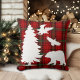 Un diseño elegante para el invierno con fondo rojo, negro, verde tartán y animales y árboles del bosque.