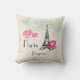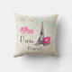 Una almohada con un bonito fondo vintage con rosas débiles y fleur-de-lis. Enlosado sobre la parte superior se encuentra un ilustracion de la torre del eiffel. Una impresión de pintalabios rosados al lado del famoso monumento que dice xoxo! y la tipografía lujosa que dice "amor amor amor amor" Paris Bonjour! El texto puede cambiarse/personalizarse para adaptarlo a sus necesidades.