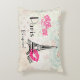 Una almohada con un bonito fondo vintage con rosas débiles y fleur-de-lis. Enlosado sobre la parte superior se encuentra un ilustracion de la torre del eiffel. Una impresión de pintalabios rosados al lado del famoso monumento que dice xoxo! y la tipografía lujosa que dice "amor amor amor amor" Paris Bonjour! El texto puede cambiarse/personalizarse para adaptarlo a sus necesidades.