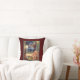 Patriotic Christmas throw pillow with a view of the Nativity scene in a stained-glass Church window and the American Flag draped over the Bible down in front of the window.