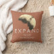 "Expanda sus horizontes" es a menudo el mejor curso para desatarse y avanzar. También puede llevar al descubrimiento de un maravilloso potencial y oportunidades en tu vida y en ti mismo. A un lado de la almohada, este mensaje motivador y inspirador aparece con letras claras en un fondo de roya naranja para un diseño abstracto parecido a un sepia en marrón oscuro, amarillo pálido y marrón. Por otro lado, el diseño sin palabras, también sobre un fondo de óxido naranja.