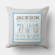 Almohada de anuncio de nacimiento de bebé niño a rayas azules, grises y blancas adorablemente linda con un elefante azul bebé dulce. Edite para incluir todos los detalles del nacimiento de su precioso bebé.