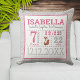Almohada de anuncio de nacimiento de niña adorablemente linda con lunares rosados y grises y blancos con un dulce zorro del bosque con un lazo rosa. Edite para incluir todos los detalles del nacimiento de su precioso bebé.