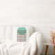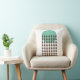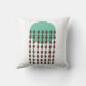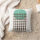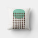Esta almohada de tiro tiene un diseño moderno de mediados de siglo con un círculo verde-mar con cadenas de diamantes marrones.