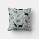 Pastores australianos cortos / Perros australianos con abrigos negros, marrones y merluzas sentados y parados con huesos de perro dispersos y huellas de pata en un fondo azul claro.