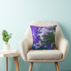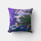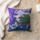 Waterlilies Blue es fotografía/arte digital combinado. Fotografía de estanques de hojas de lirio, picos altos de hojas de iris y agua. La parte digital es la mejora del color. El color es azul/violeta y tiñe las hojas y la hierba. El patrón está a ambos lados de la almohada.