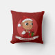 Tirar almohada con un ilustracion de un lindo sonriente bebé hispano/latino sosteniendo un regalo de Navidad y usando un gorra de Santa Claus; en un círculo rojo sobre un fondo rojo, un diseño de vacaciones para Navidades con una plantilla de texto editable para tu nombre o mensaje