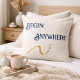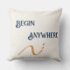 Modern minimalist throw pillow with "Begin anywhere" quote in sophisticated navy on warm cream background with terracotta geometric accent. Perfect motivational decor for home offices, living rooms, or bedrooms. Ideal gift for graduates, entrepreneurs, or anyone starting a new journey. Clean Scandinavian-inspired design complements contemporary and bohemian interiors beautifully.