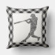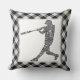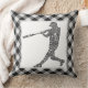 Cojín decorativo de caligrama del jugador de béisbol Softball. Fondo negro de gingham. Disponible en tamaños de 16" x 16" o 20" x 20", y en algodón o poliéster. Utilice el menú "size" situado a la derecha de la pantalla para cambiar las almohadas.