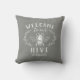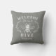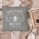 Bienvenido a este agradable cojín de tiros con la temática de las abejas, decorado con un ilustracion de abejas de estilo vintage y con detalles de hojas botánicas sobre un suave fondo gris. "Bienvenidos a nuestra colmena" aparece con letras blancas. Personalice el nombre de su familia en la parte inferior.