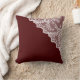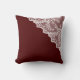 Esta almohada de bonito tiene una imagen de encaje blanco en una esquina. El patrón de encaje consiste en pequeñas flores y hojas. Está situado sobre un fondo rojo marrón de bonito. La parte posterior de la almohada tiene la misma imagen. *Atención: la imagen de encaje está impresa en la almohada.