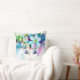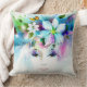 Blooming Beauty Throw Pillow. A dreamy portrait of a woman’s face surrounded by colorful flowers, leaves, and butterflies in a burst of vibrant hues.