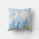 La almohada Blue Circus Fun incluye dos elefantes azules, uno en un gorra fiesta, una bola verde, globos azules, una tapa grande con rayas y polka, y un texto que dice "¡Circo!".